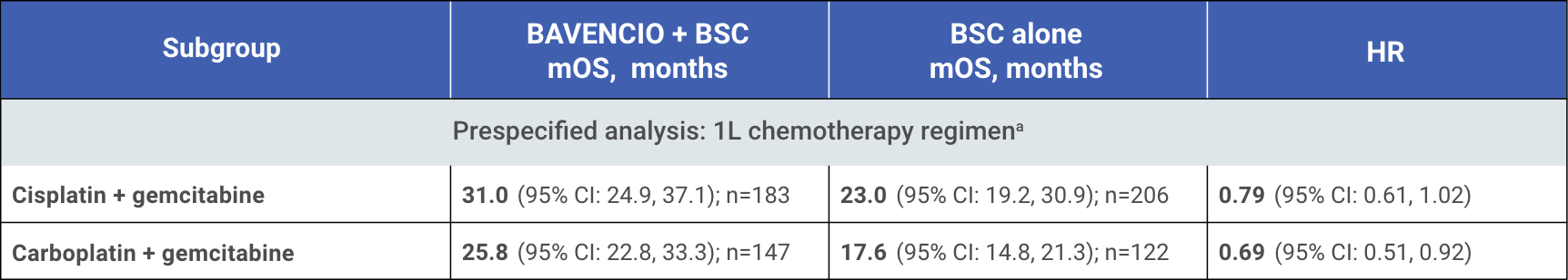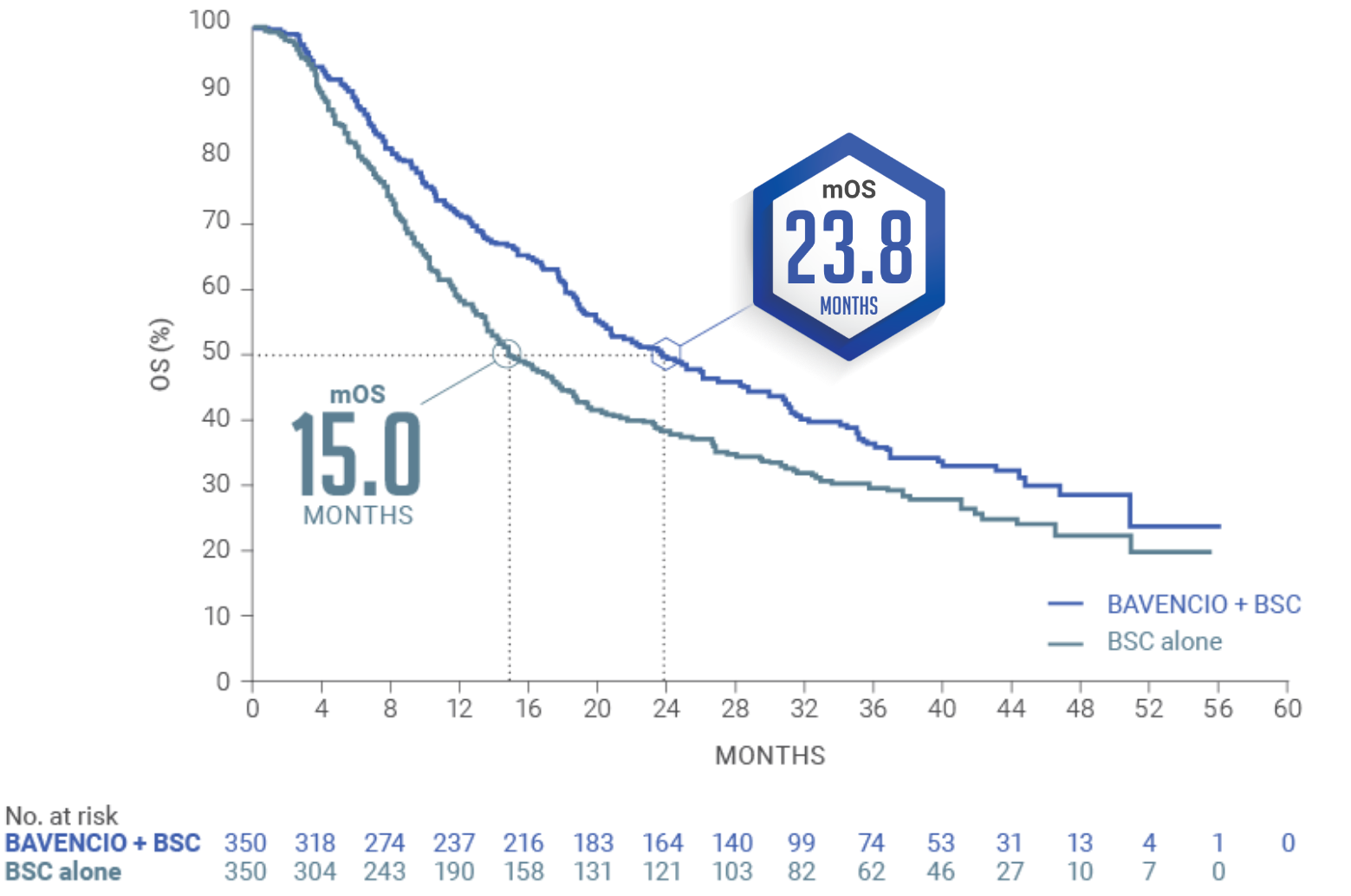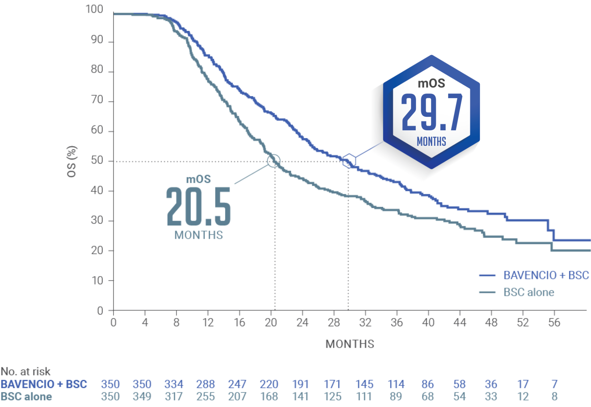 mOS of 21.4 MONTHS (95% CI: 18.9, 26.1) with BAVENCIO + BSC vs 14.3 MONTHS (95% CI: 12.9, 17.9) with BSC alone (n=350 in each arm); HR 0.69 (0.56, 0.86); 2-sided P-valuea=0.001