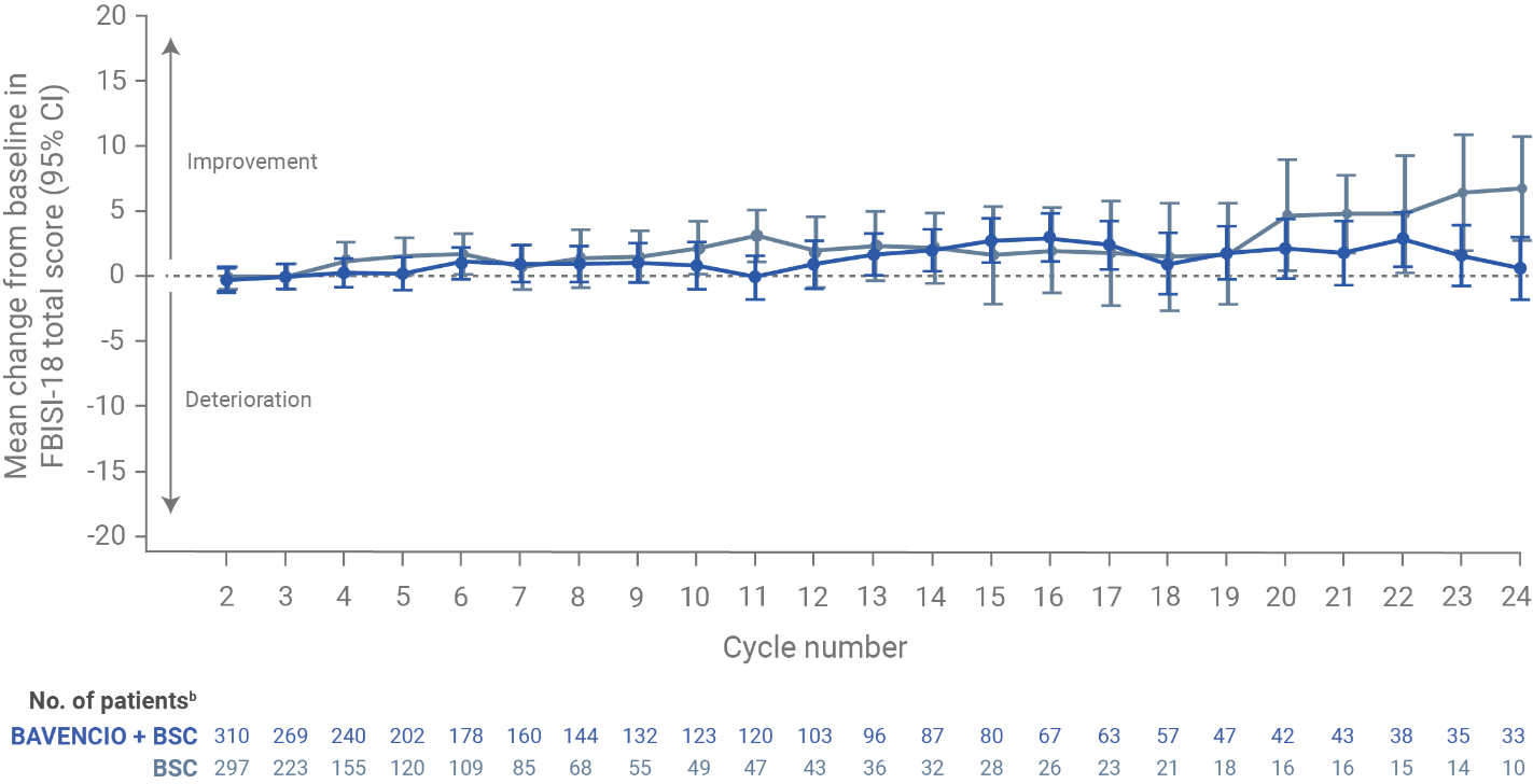 bNumber of patients who completed the baseline assessment and the assessment at the respective cycle. Data for on-treatment visits that had 10 or more patients in both arms are shown. For the BAVENCIO + BSC and BSC-alone arms, 333 and 330 patients responded to one or more items at baseline, respectively.